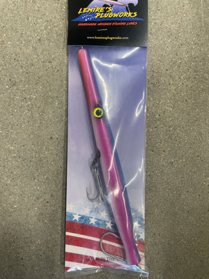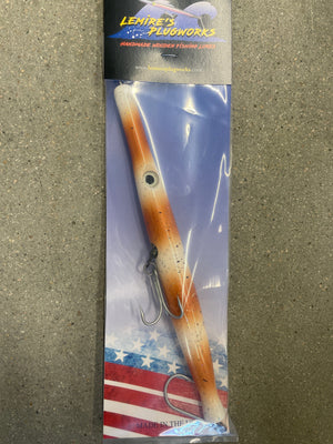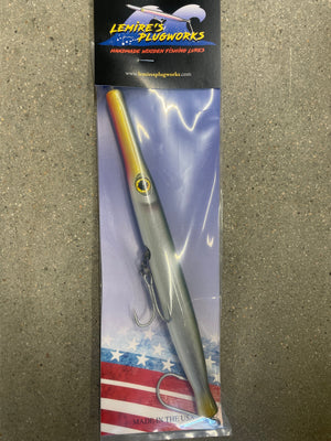 This is a 10" 4oz slow sinking needlefish. They quickly became a staple on Block Island and surrounding areas and have landed many a bigfish. They have a slow to moderate sink rate with the tail downward. Retrieving the plug slowly will glide right under the surface, while twitching the rod tip every 5 or 10 seconds, or let it drop to the bottom and twitch the rod to imitate a sand eel hatching. They also can be used on the surface like a pencil popper.