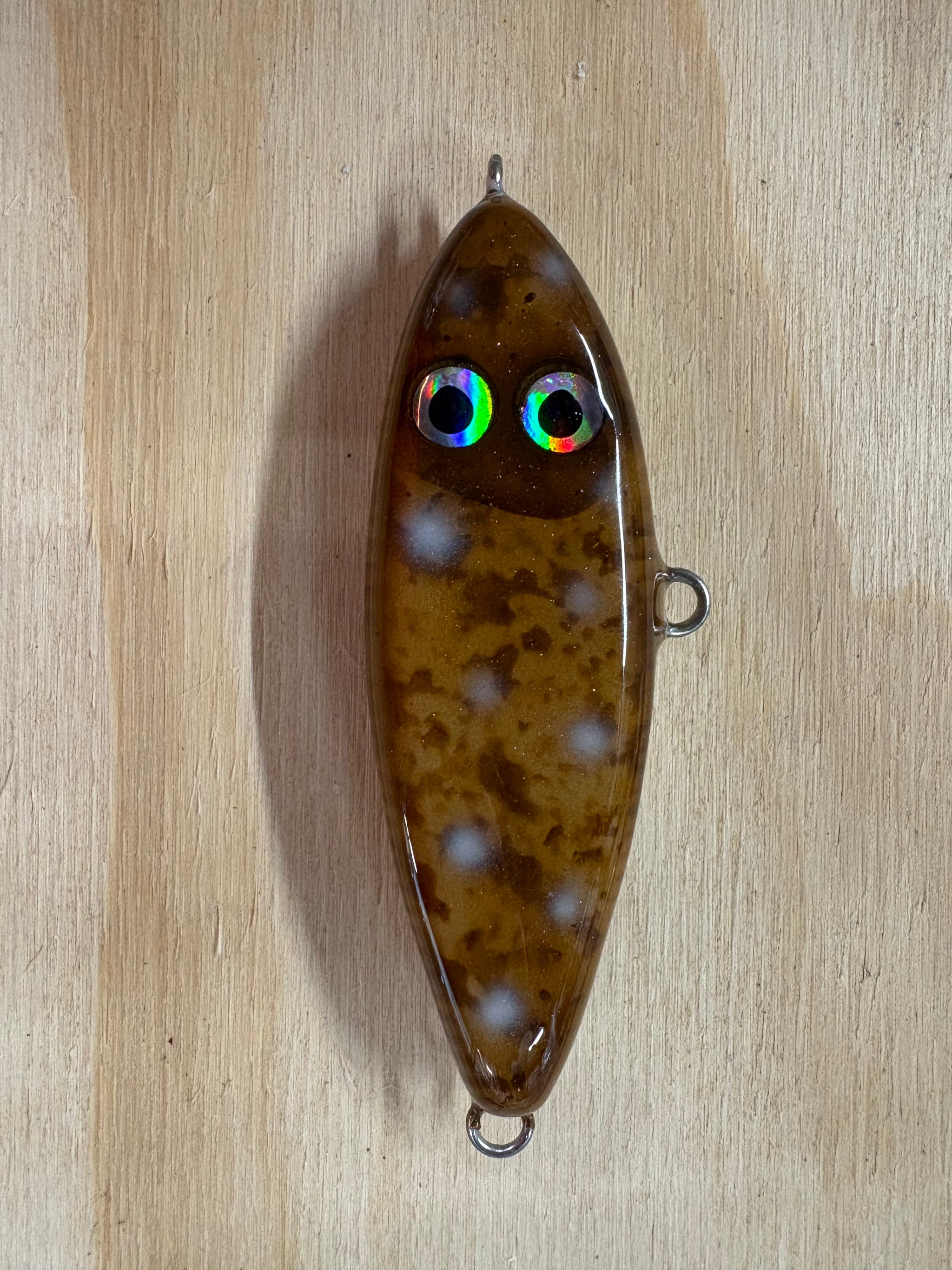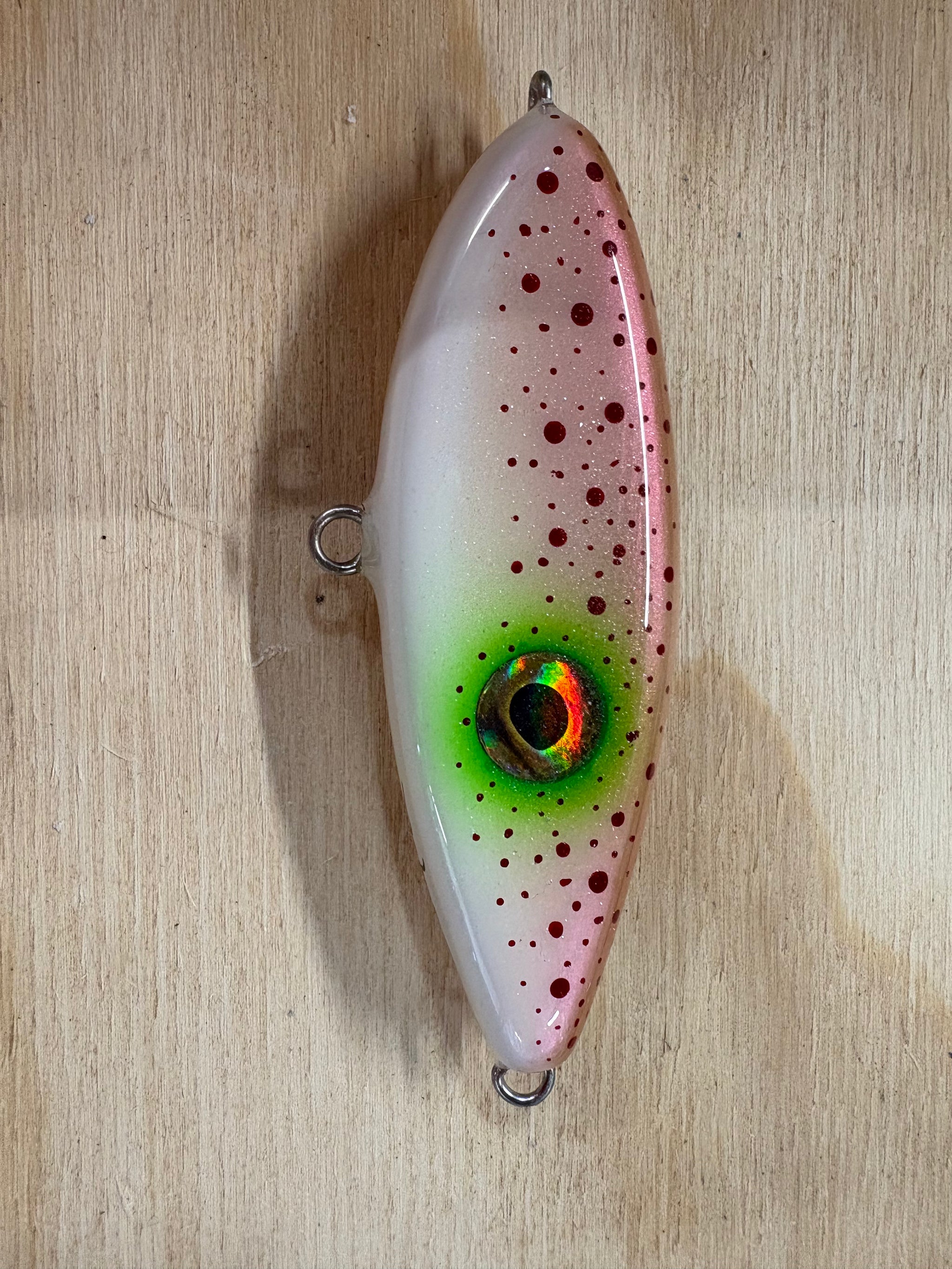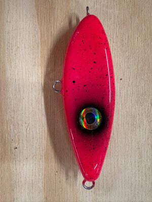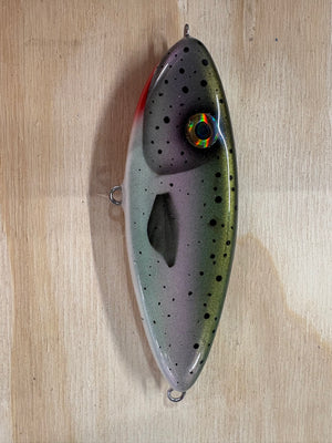 Stryker's Custom Glidebaits are made out of wood and through-wired so they are up to par for targeting large fish. The lures come in three sizes: 3.5" - 1.5oz, 5" - 2.2oz and 6" 5oz. These are unrigged but we would recommend rigging just one treble on the belly and a tailflag off the back. 1/0 treble for the 3.5" and 3/0 treble for the 5" and 6".