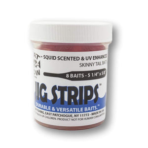 Fat Cow Skinny Tail Jig Strips are the replacement for the beloved Uncle Josh 70S. They were intentionally designed with an exaggerated taper at the end. The result is a straight strip with unmatched tail action. Compared to other straight strips on the market, this unique design mimics the tail twitch of a live swimming bait. More durable than soft bait grubs and other alternatives and they do not dry out so they can be left on the hook. Jar fits right in your pork rind holder.