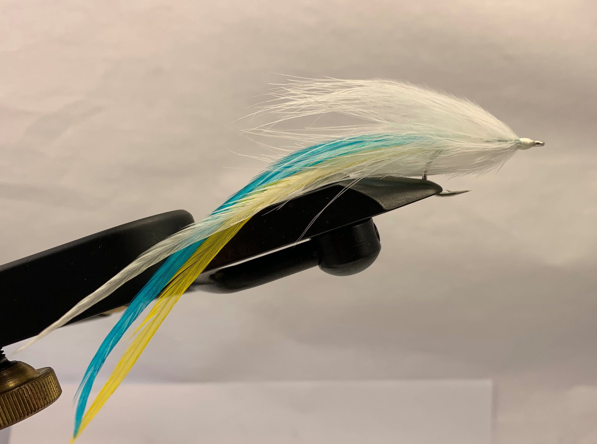 A soft hackle sand eel imitation for those extra picky bass. Tied on a size 2 Mustad Tarpon Hook.