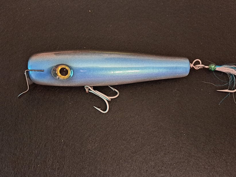 5.5", 2oz. Fitted with the classic Danny Pichney Conrad lip which is bent on either side for a more pronounced swimming action and less wobble this plug is rigged with a sigle belly hook and buck tail dressed rear teaser hook for a great action and look in the water, this plug is fitted with a top slot eye which can be swam shallow or deep depending on how the plug is tuned.