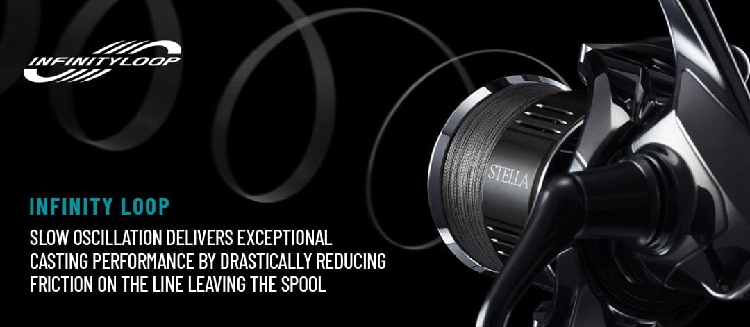 The Stella FK features many proven Shimano technologies, such as cold-foraged HAGANE gears, HAGANE body, MIcroModulle II, silent drive, X-Ship and more. This new generation is given several new technologies such as InfinityXcross technology, Duracross drag system, InfinityLoop technology, and Anti-Twist Fin. Shimano's new InfinityXcross technology extends the gear teeth horizontally to distribute the load across the gear tooth more evenly, thus providing enhanced gear durability. This technology essentially reduces hotspots on the gear teeth themselves to even the load. Duracross drag system provides the smooth performance of a felt drag that is often seen on smaller freshwater reels where very light line is used, however with the toughness and capability of Cross Carbon drag. InfinityLoop enhances the spool oscillation to produce a more even line lay throughout the retrieve, therefore reducing line friction when casting due to a lesser line lay. Lastly, a new Anti-Twist Fin (an elastic polymer on the underside of the roller) as well as a redesigned drag knob and fortified propulsion lip, provides superior line management and enhanced reeling performance.