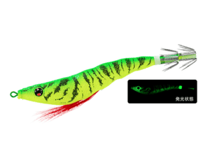 The Yo-Zuri EZ-Slim Cloth Squid Jigs are "Egi" style squid jigs. They are made to be fished as a single jig with a cast and retrieve pattern. This style of squid fishing is very popular in the Asian market. These lures have a keel weight. This weight gives them the balance needed for swimming action and for bouncing off the bottom. These lures glow in the dark making them ideal for squid fishing in dirty water or at night.